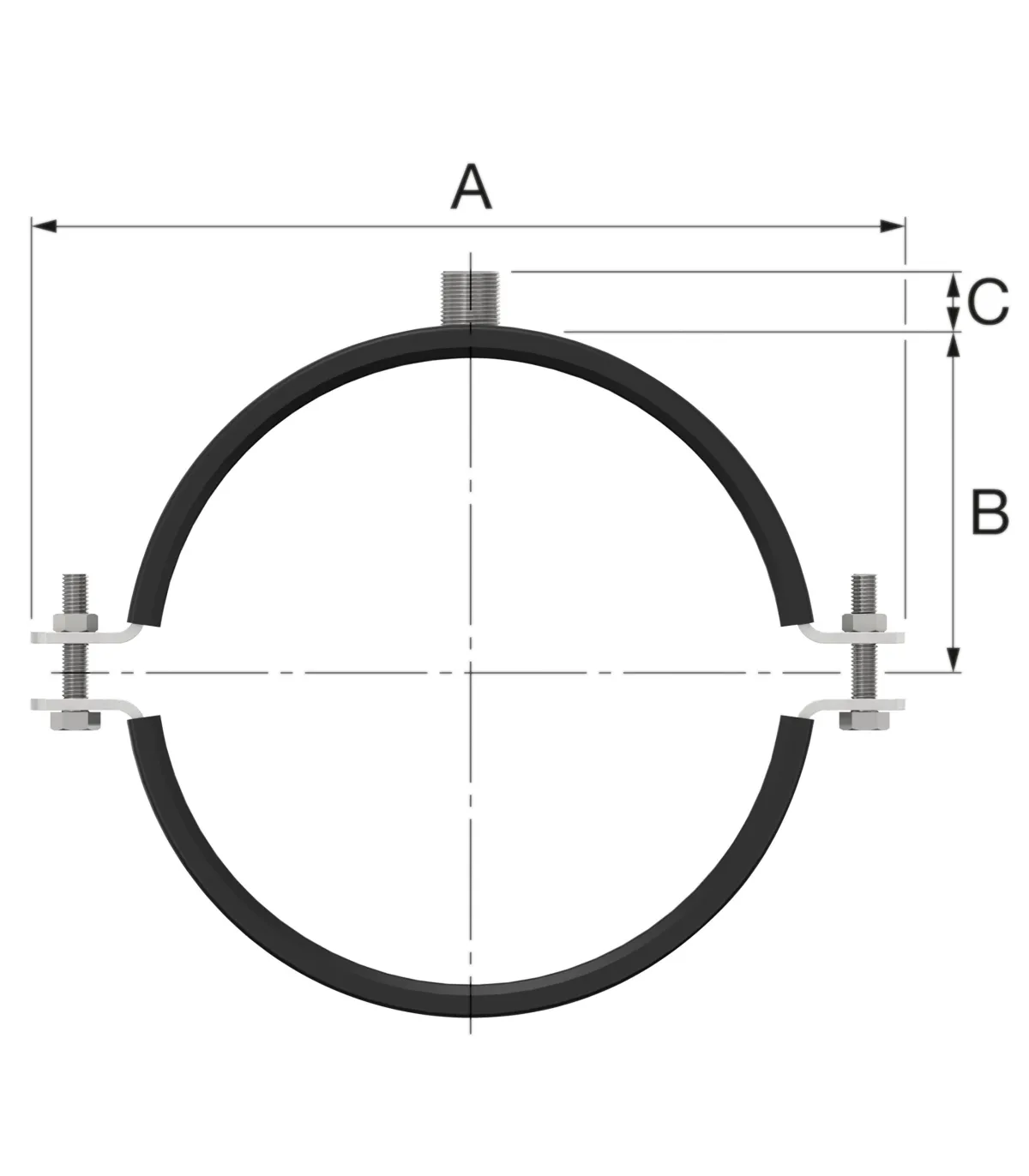 Abrazadera isofónica reforzada, diseñada para fijar tubos de ventilación, plásticos o metálicos de entre Ø18 y Ø355 mm (según el modelo). Se puede emplear en instalaciones de suministro o evacuación de agua o de transporte de gasóleo, entre otras. Cuenta con una tuerca soldada de doble rosca M8-M10 y una goma aislante de EPDM que reduce el ruido y las vibraciones. Cumple el Código Técnico de la Edificación y la norma DIN-4109 de aislamiento al ruido. Está fabricada en acero zincado.