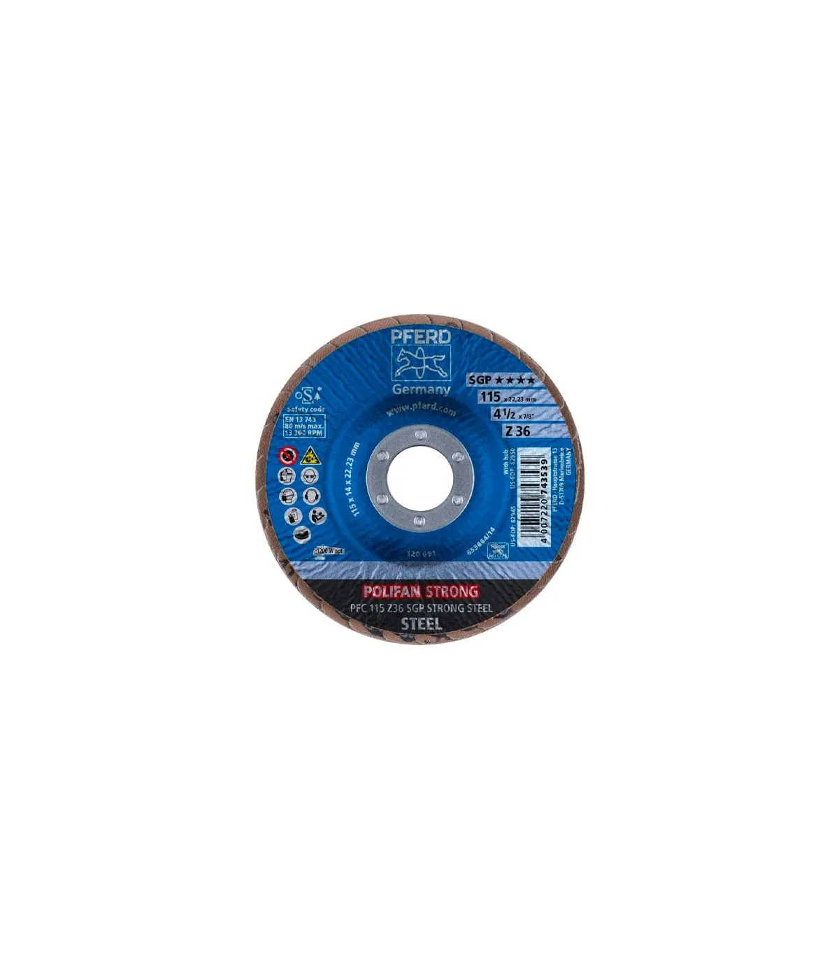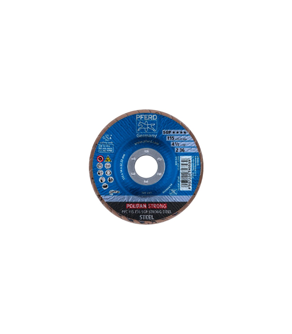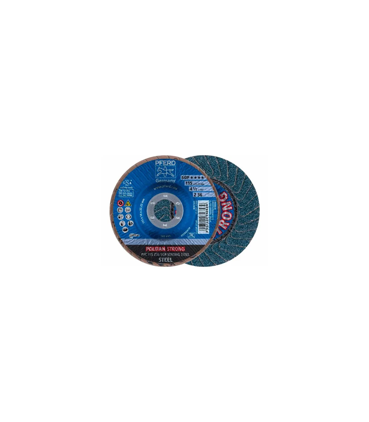 "La forma de construcción patentada POLIFAN® STRONG abre una dimensión totalmente nueva de amolado sobre acero. Las excelentes ventajas representan un avance único en la comparativa de rendimientos. Rectificado rápido debido a la agresividad constante de amolado hasta el último grano abrasivo. Alta rentabilidad gracias al mayor rendimiento por unidad de tiempo. Cantidades de arranque máximas posibles. Alta rentabilidad debida al menor desgaste del disco. Duración extrema. Alta rentabilidad gracias al menor cambio de herramienta y tiempos de preparación. Aprovechamiento óptimo de máquinas potentes. Abrasivo: Corindón de circonio Z; Materiales: Acero; Aplicación: Cordones de soldadura, canteado y desbarbado."