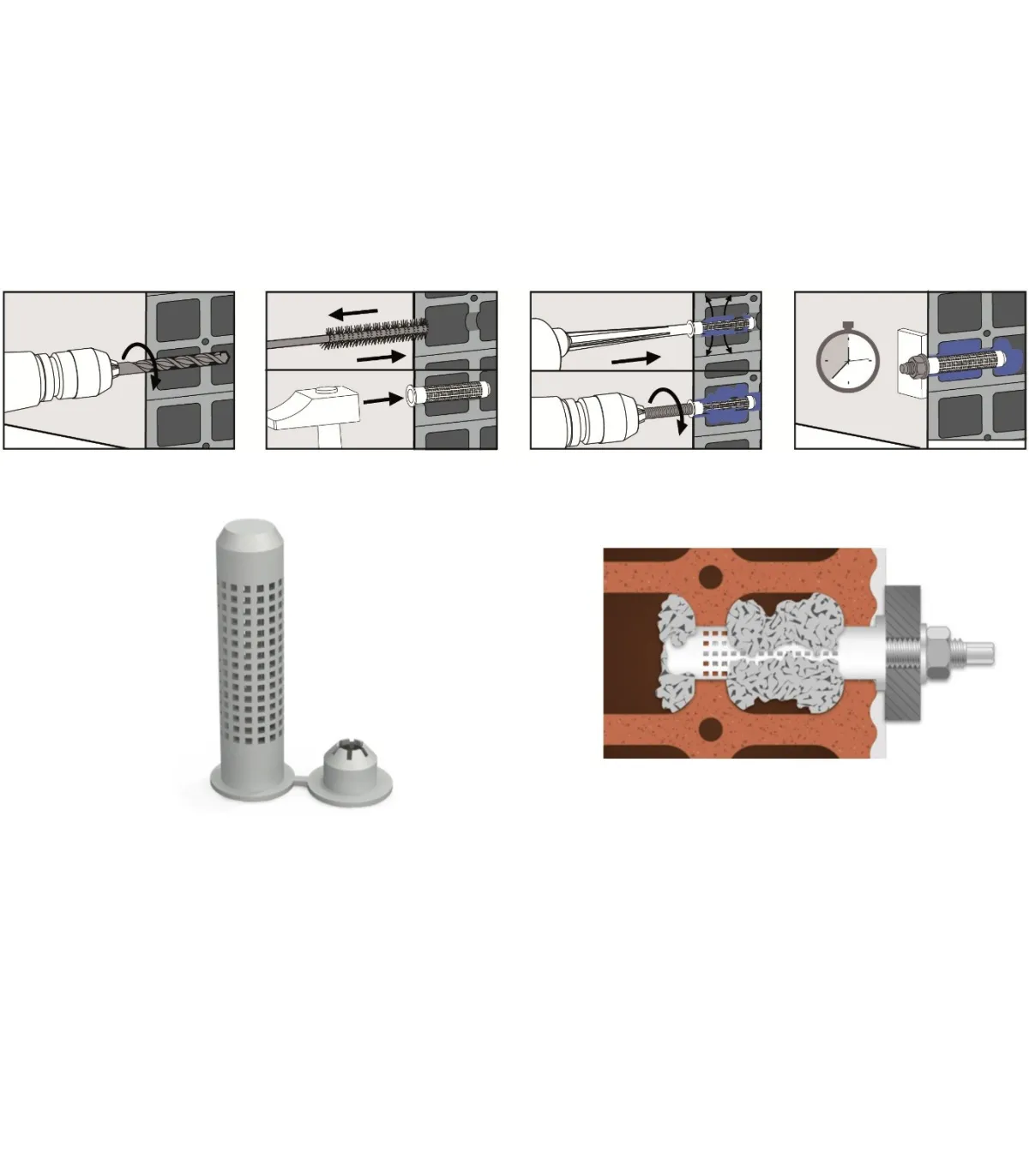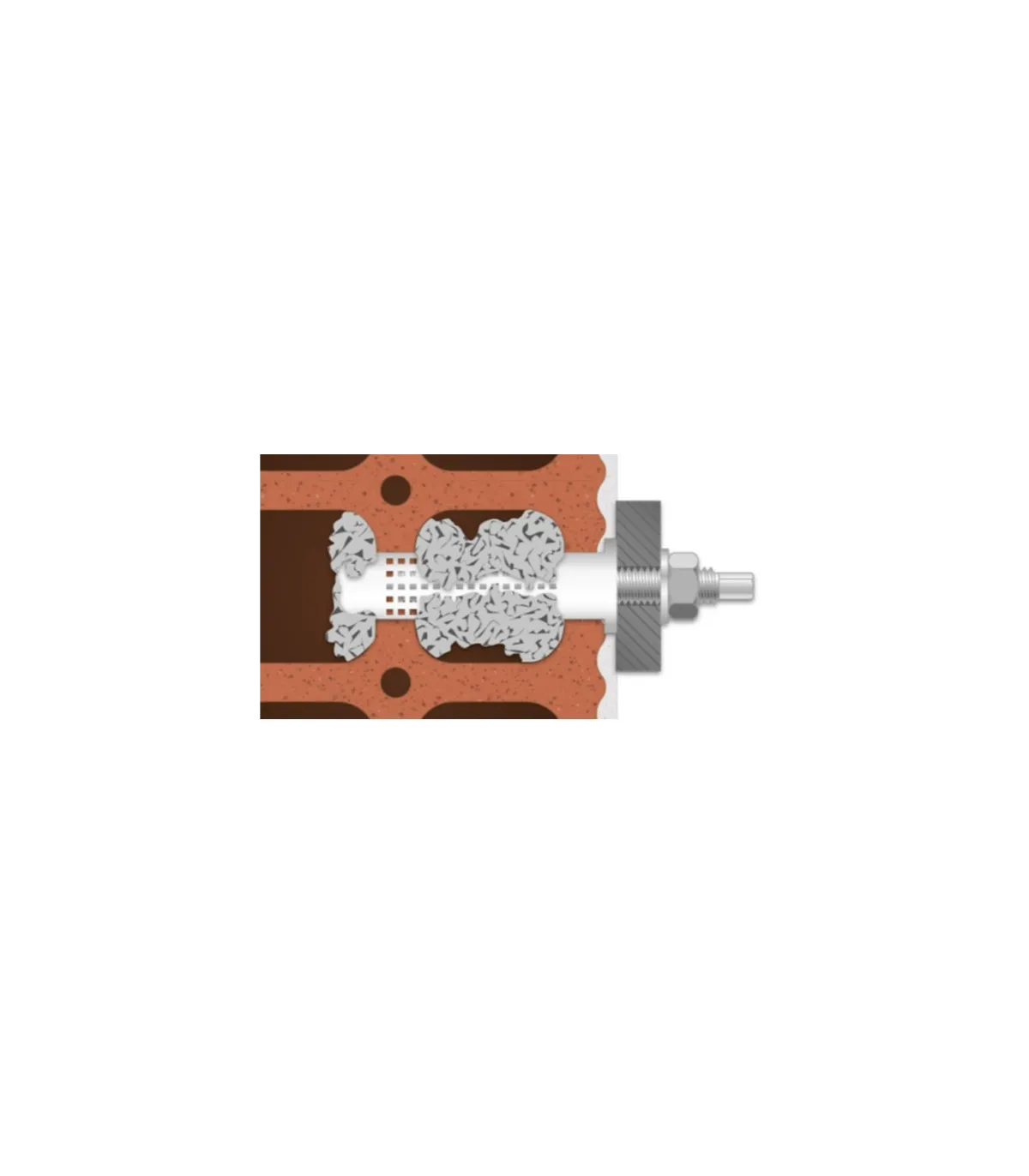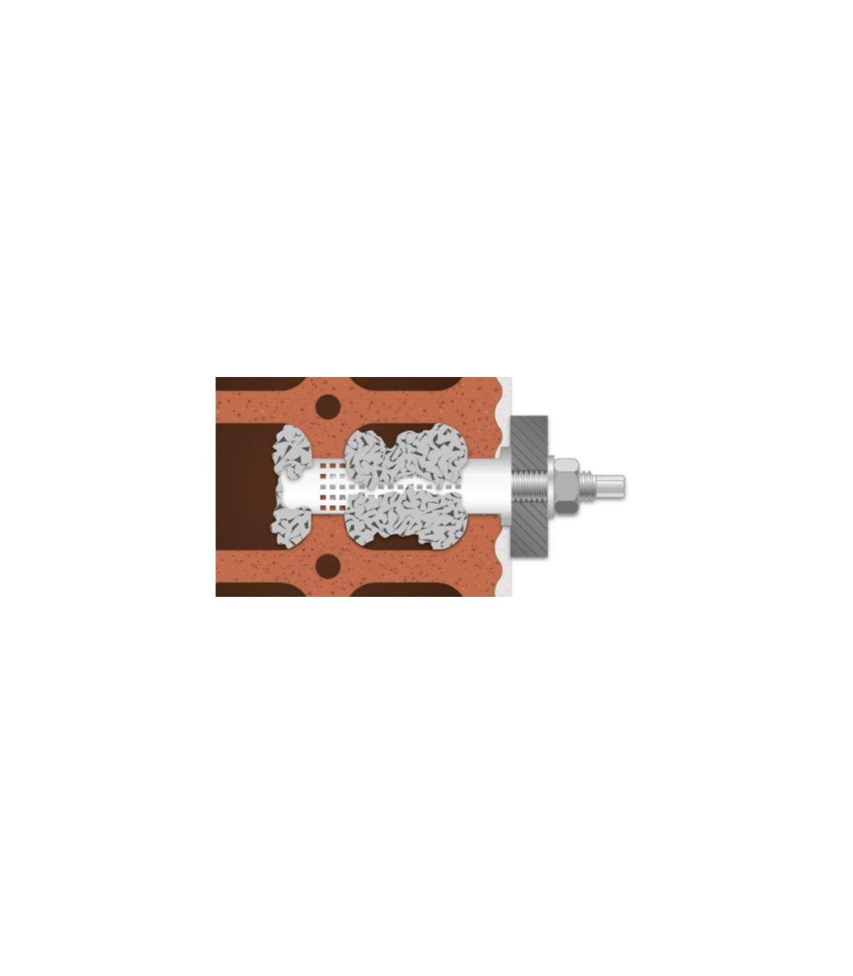 Sus diminutas perforaciones favorecen la salida del anclaje químico, rellenando los huecos que forma la obra hueca y a su vez ahorrando una cantidad importante de producto químico.