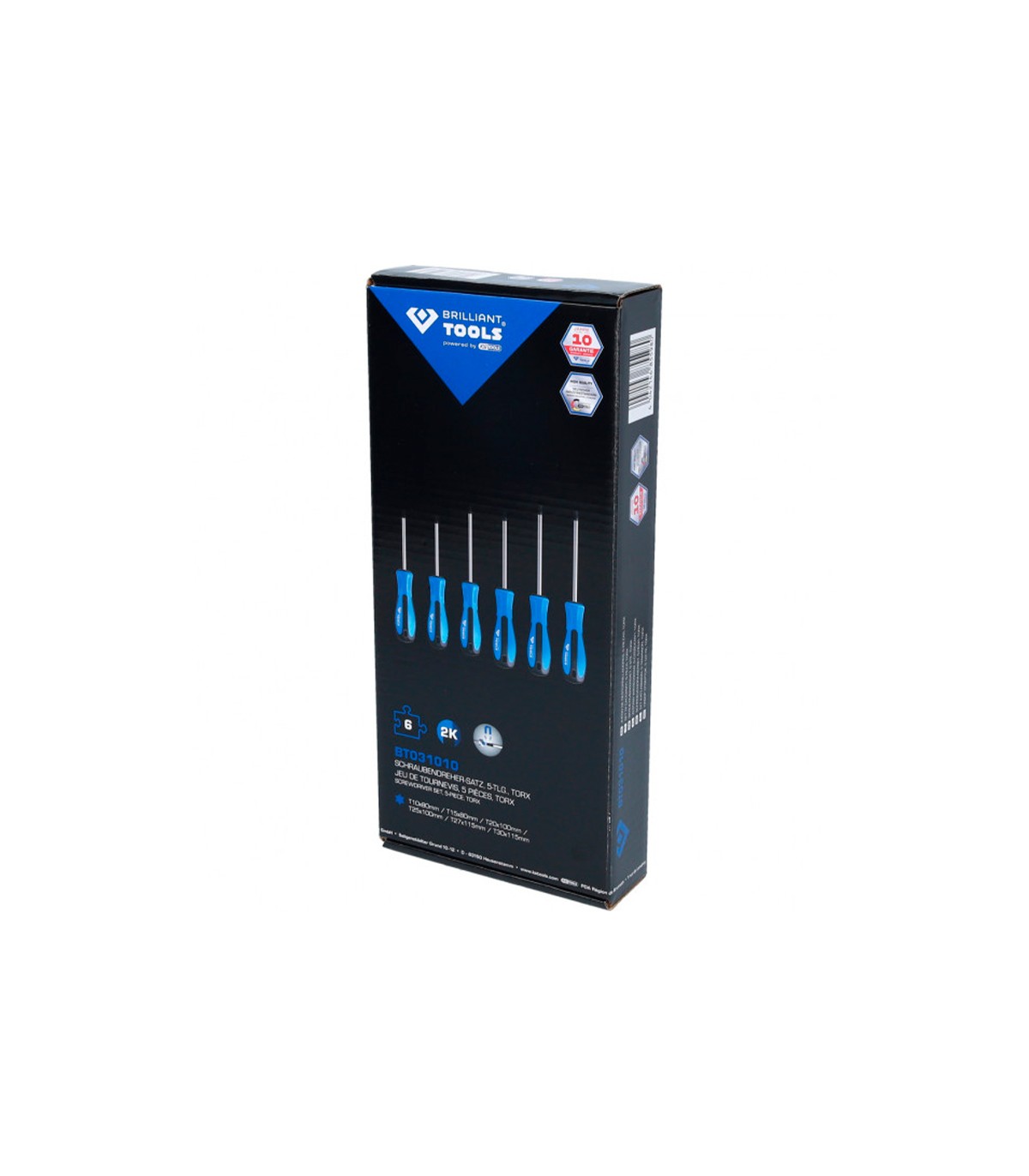 El juego de destornilladores Torx BRILLIANT TOOLS BT031010 es una composición práctica para tornillos Torx. El mango ergonómico con orificio para colgar garantiza un trabajo eficiente, preciso y sin esfuerzo. Gracias a la forma de su mango, permite una óptima transmisión de la fuerza con el mínimo esfuerzo para la mano. Para fomentar la visibilidad y la selección correcta, el destornillador presenta la forma del actuador indicada en el extremo del mango. El vástago es de acero al vanadio bonificado. mayor tenacidad y una alta resistencia al desgaste