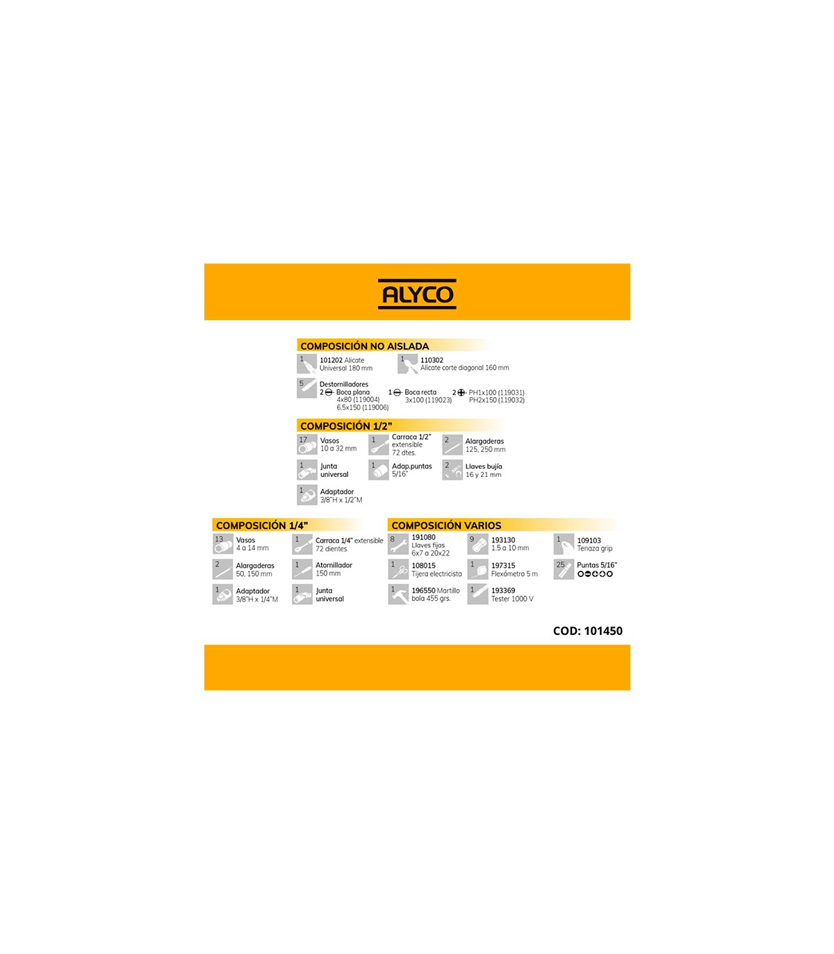 Llaves de vaso de 1/4": Llave de carraca 1/4” extensible 72 dientes. 13 llaves de vaso de 4 a 14 mm. 2 Alargaderas de 50 y de 150mm. 1 Junta universal. 1 mango atornillador de 150 mm. 1 Adaptador 3/8”H x 1/4”M.