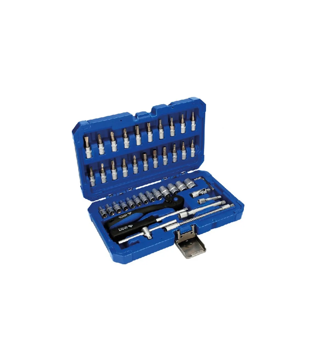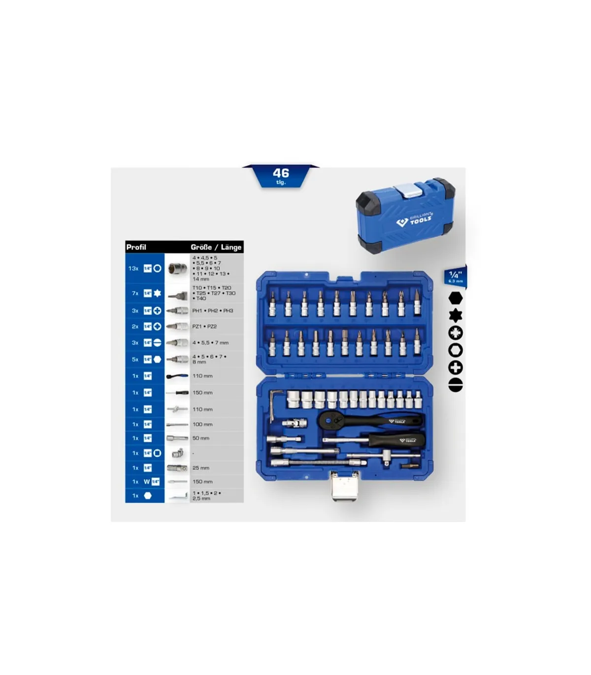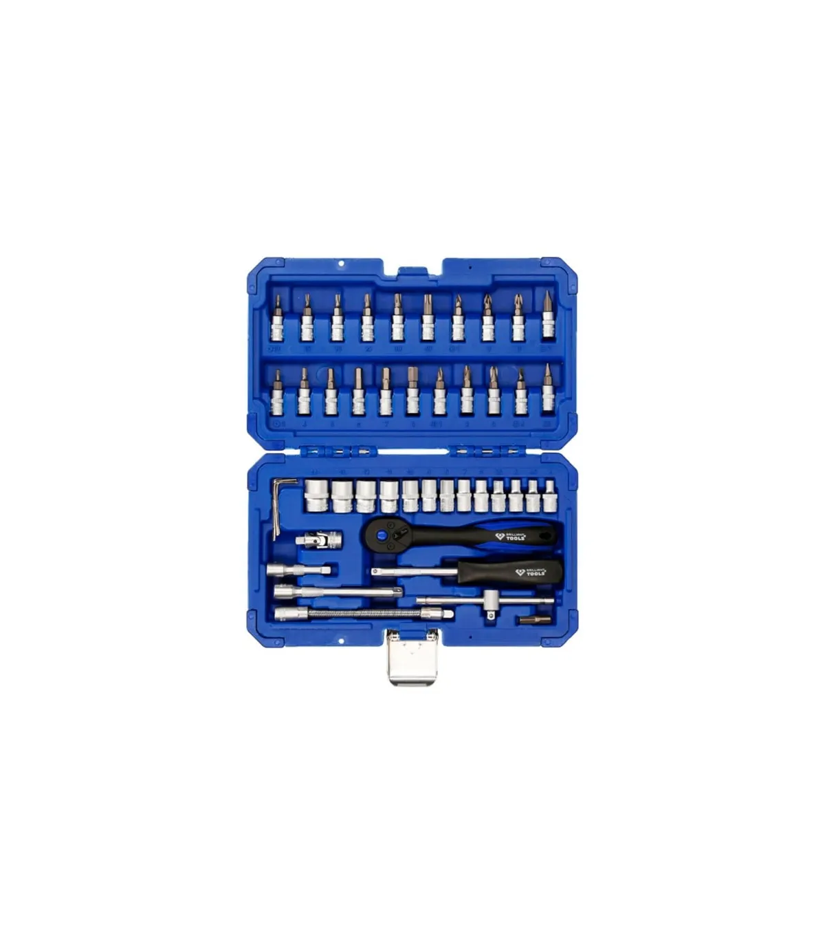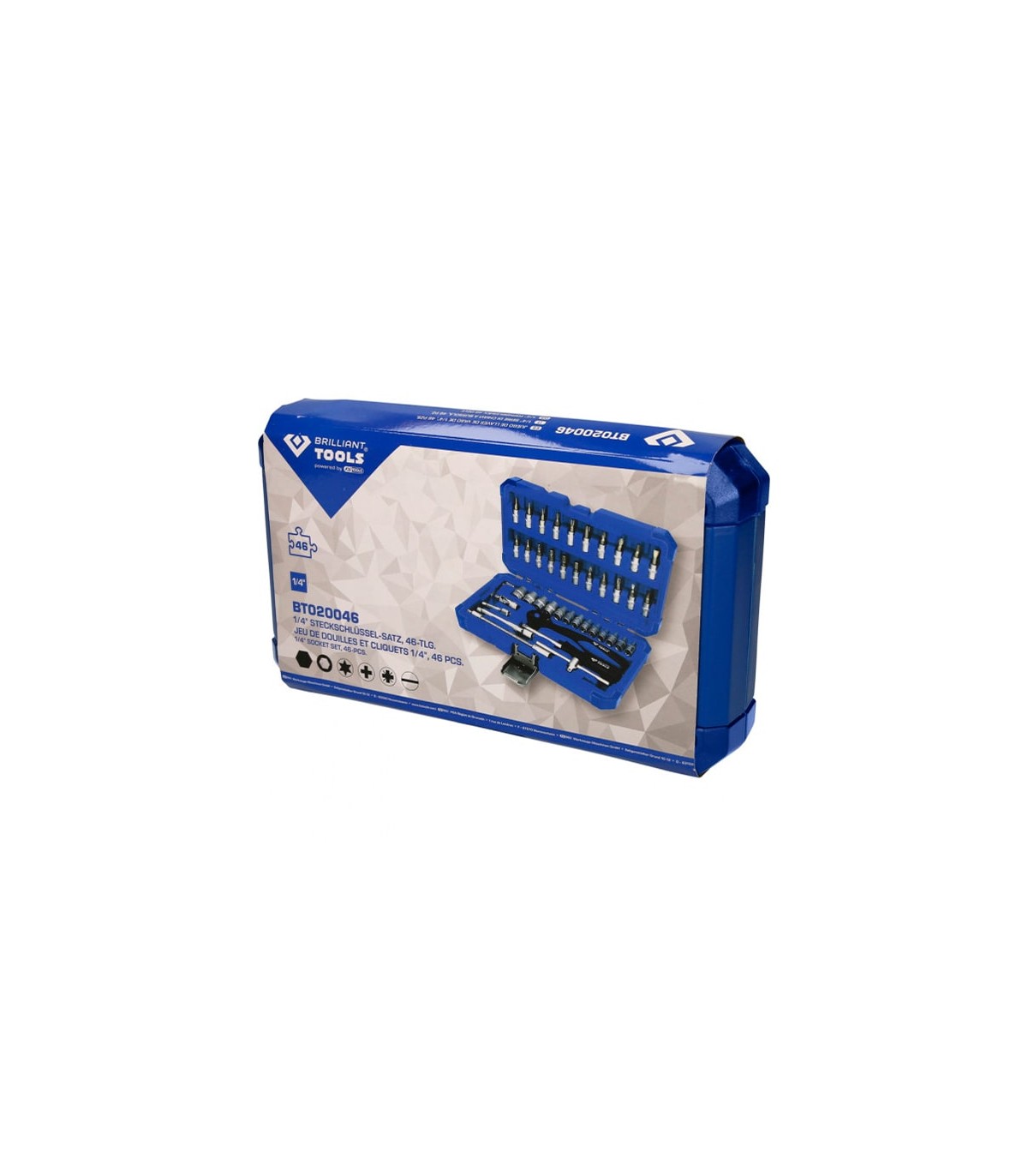 El juego de llaves de vaso de 46 piezas BRILLIANT TOOLS BT020046 se fabrica según normas DIN. Todo el juego utiliza el cuadrado conductor interior de 1/4" (6,3 mm). Se suministra en un práctico maletín con bisagras metálicas, cierres y sujeciones de presión para las herramientas. La rotulación presente en el maletín permite una rápida identificación de los insertos o puntas idóneos. La carraca reversible de 2 componentes permite el uso a derechas/izquierdas con conmutación de palanca y un ángulo de retroceso de 5°. Incorpora un dentado de precisión de 72 dientes.