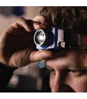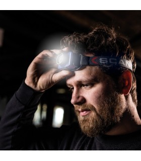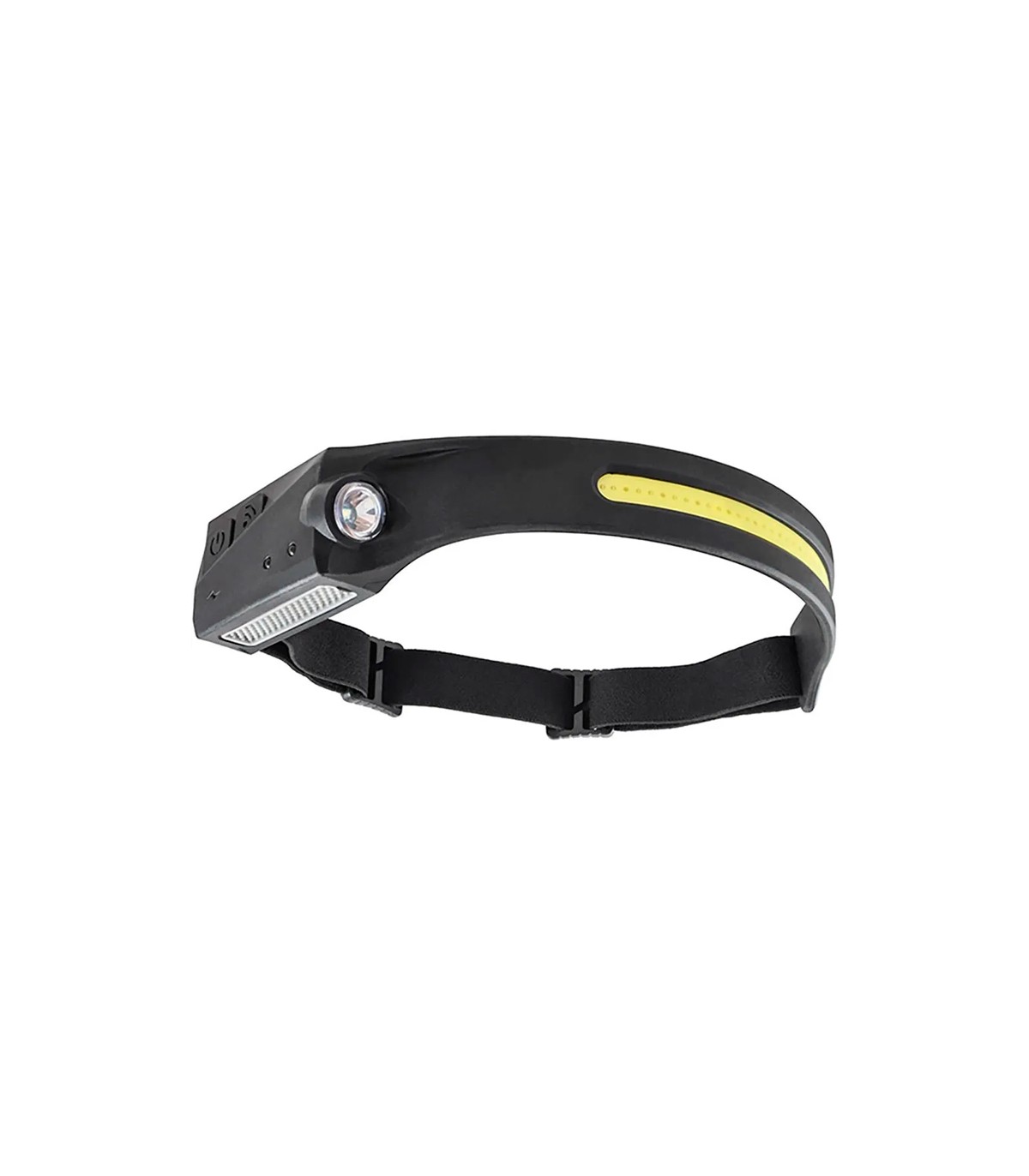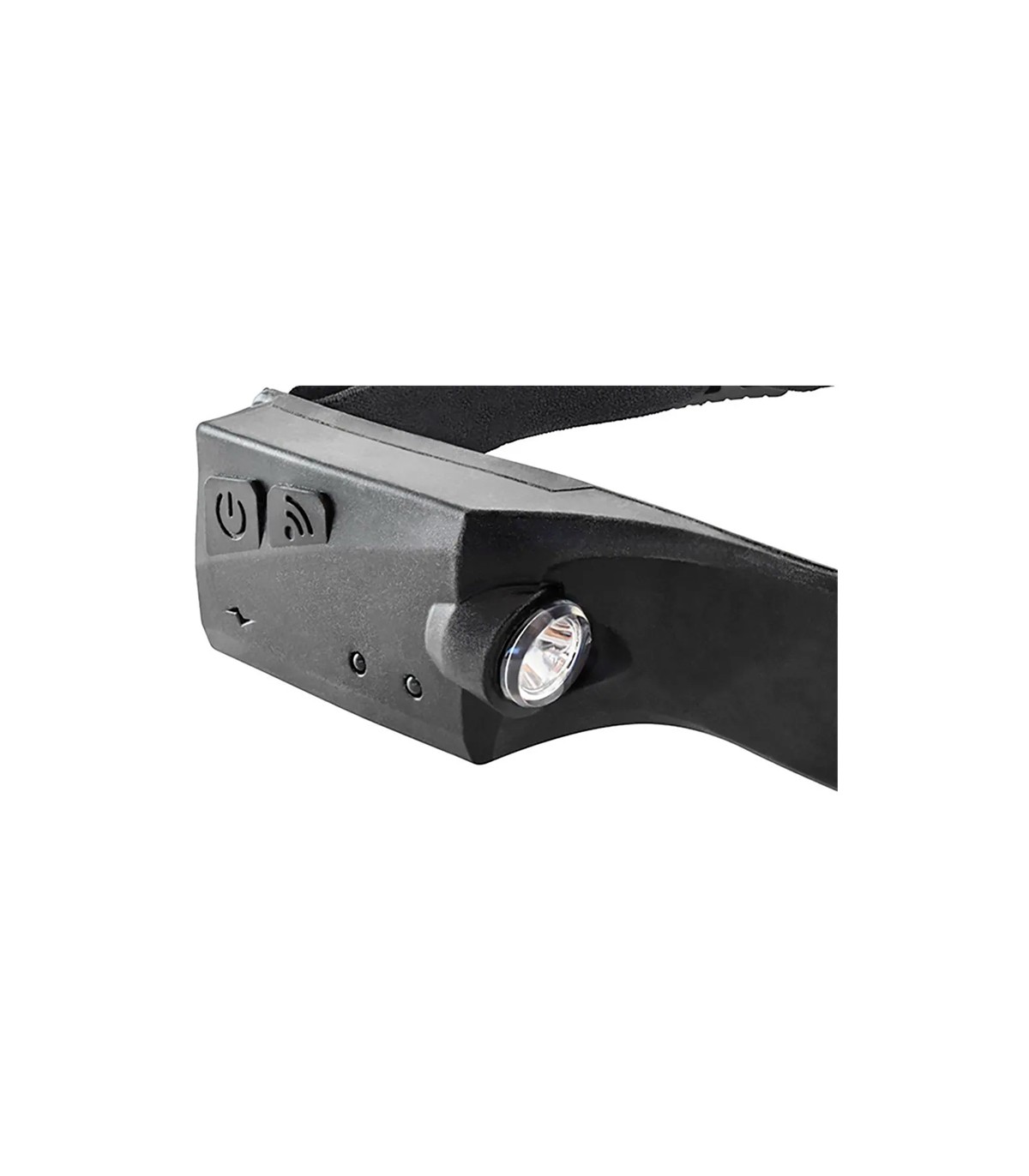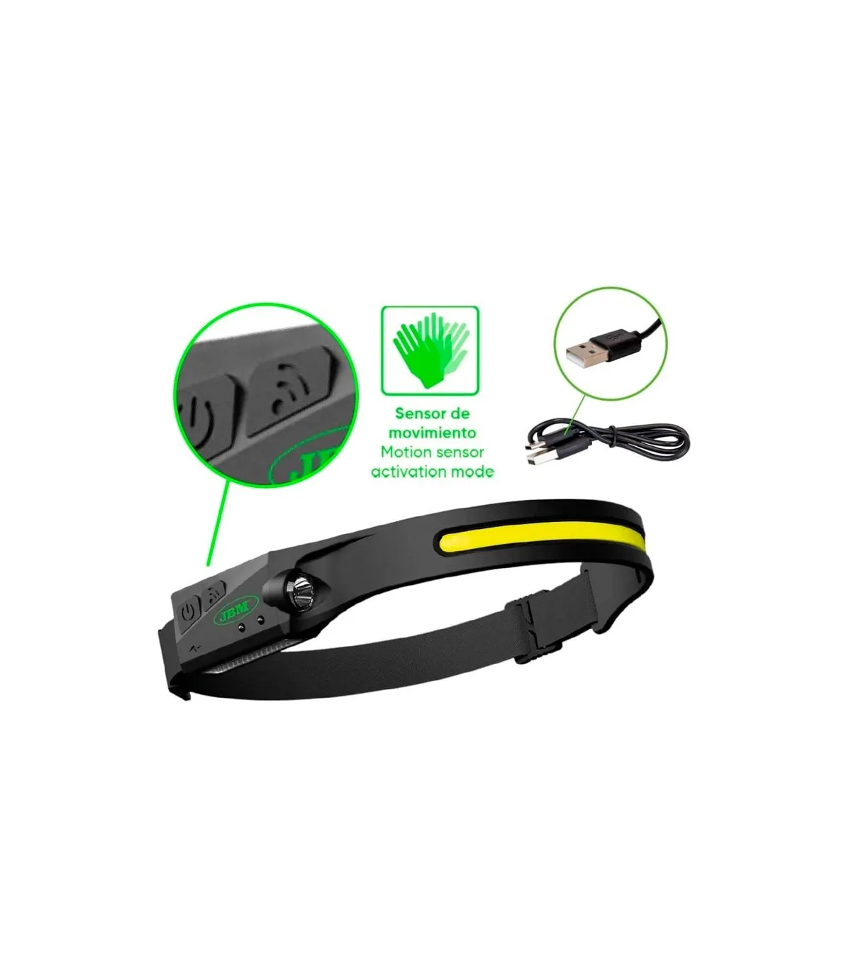 Linterna de cabeza, "frontal",  tipo correa elástica, con tira led COB frontal de 5W y  350lm y led XPE lateral de 3W y 90lm. Con bateria regargable por USB  de 3.7V 1.200mAh de Litio-Ion. Con botón de sensor de movimiento,  permitiendo activar/desactivarse y evitar el pulsador durante trabajo con manos sucias. Luz blanca 6.500k.