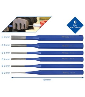 El juego de botadores para pasadores y universales de 6 piezas  está endurecido y templado para una larga vida útil.