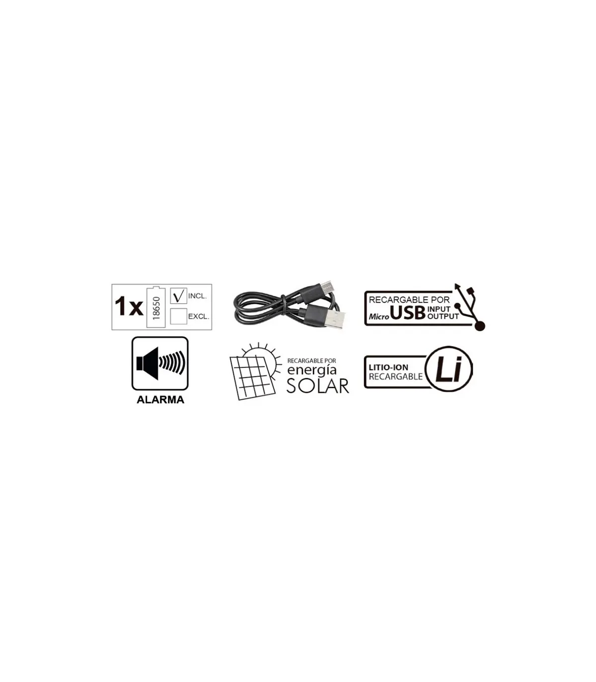potencia máxima y 800 lumens. Autonomía de 3 a 4 horas aprox. Con bateria recargable de